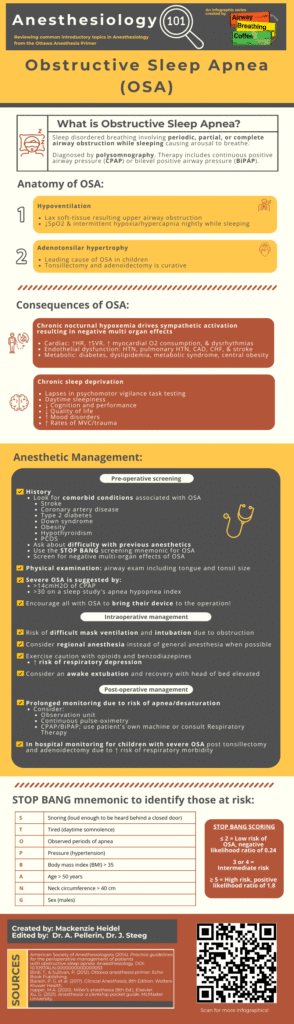 Anesthesia 101 is an infographic series by Airway Breathing Coffee that reviews common introductory topics in Anesthesiology from the Ottawa Anesthesia Primer and other resources. Enjoy this infographic about obstructive sleep apnea (OSA)!